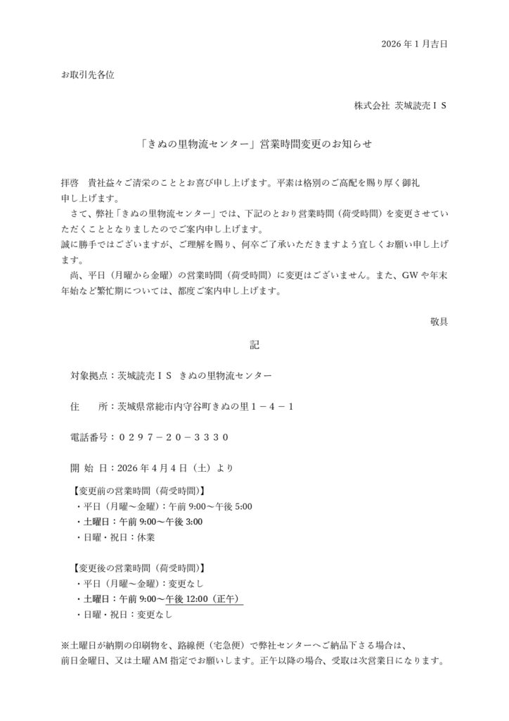 「きぬの里物流センター」営業時間変更のお知らせ